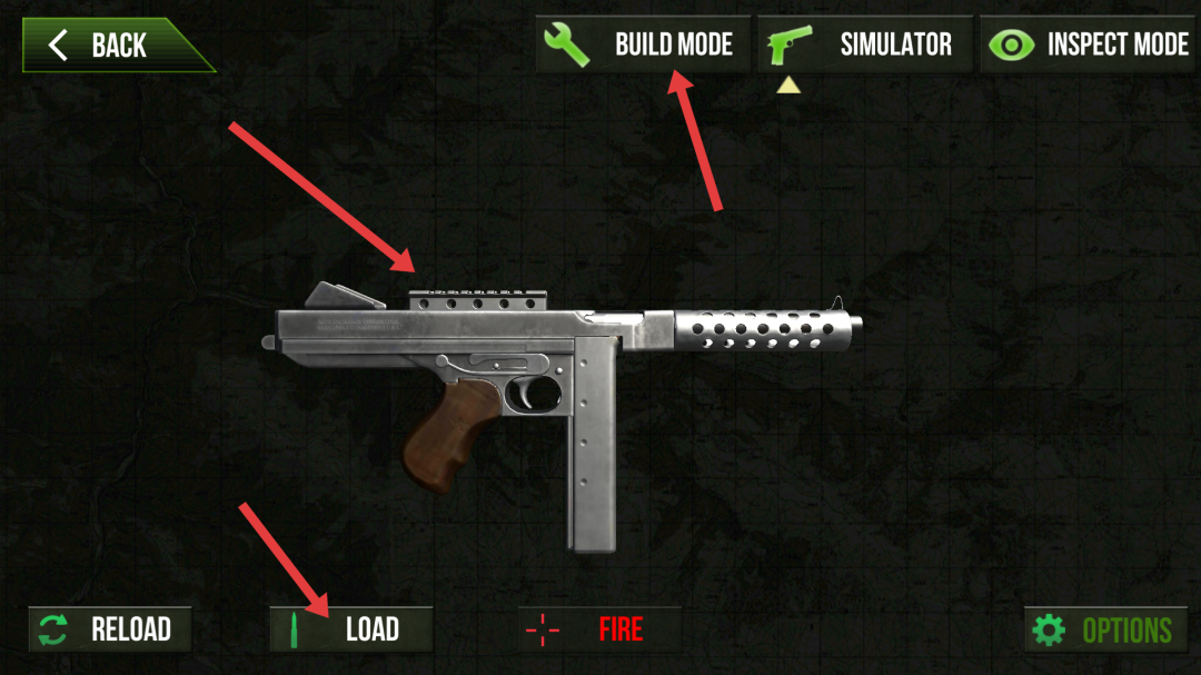 3、進入武器操作頁,點擊BUILDMODE可改裝槍支,按提示用LOAD裝填彈藥,熟悉RELOADFIRE功能,通過不同模式體驗槍械操作。