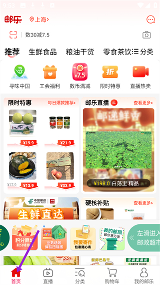 1、首頁,有搜索欄,展示尋味中國等功能入口及時限特惠、郵樂直播板塊,還有生鮮直達等內容,助力選購食品生鮮。
