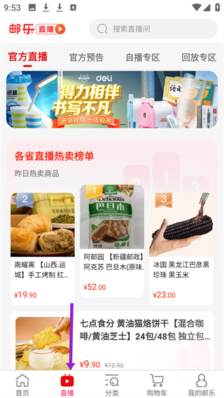 2、直播板塊,有官方直播、官方預告等分類,展示各省直播熱賣榜單及多款熱銷商品,方便用戶觀看直播選購商品。