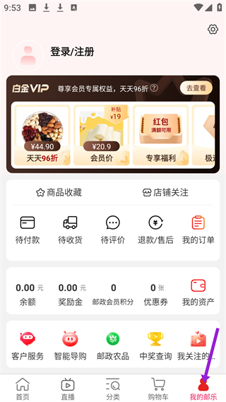 4、我的郵樂板塊,有登錄注冊入口,可進行訂單、資產管理,還有客戶服務、智能導購等功能,方便用戶管理個人賬號和業務。