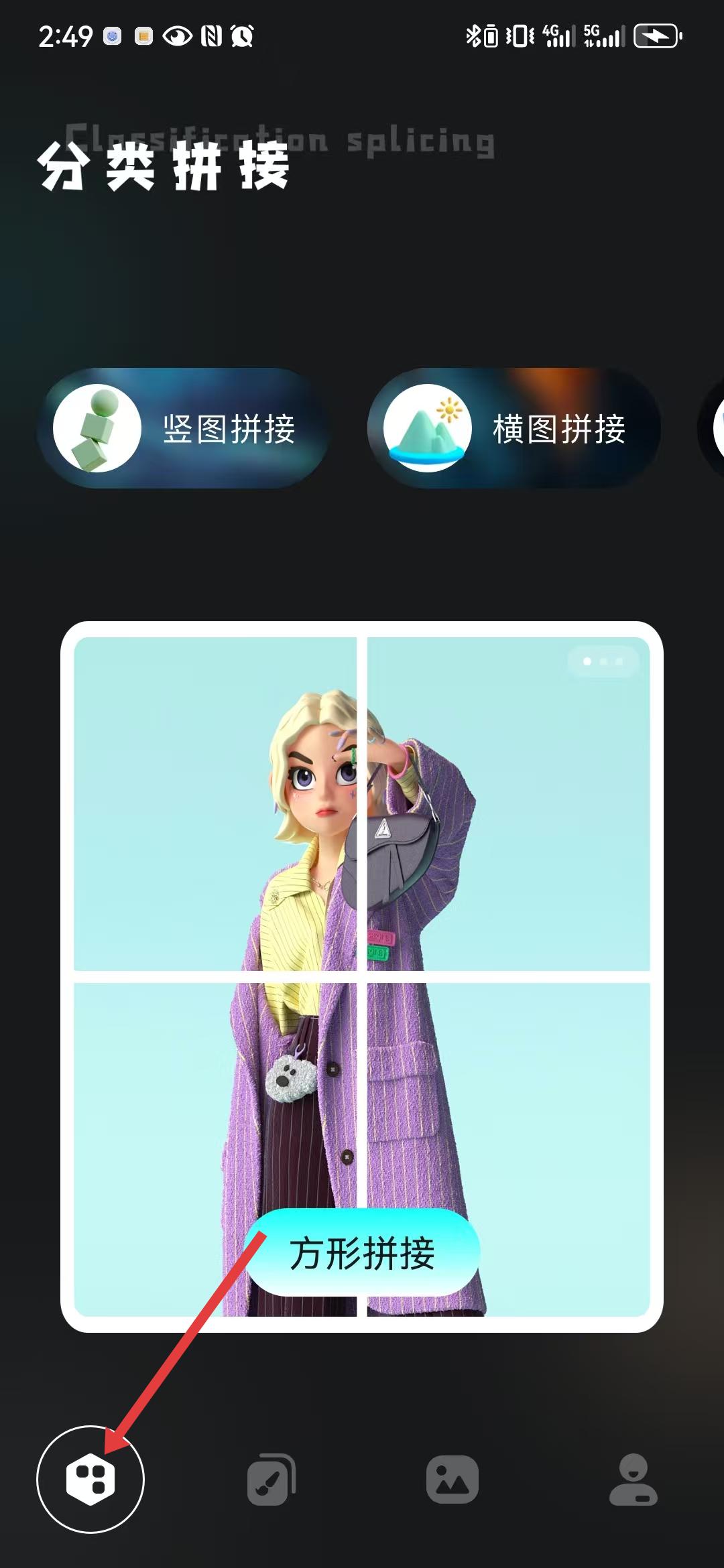 1、打開應用進入主界面后,能看到分類拼接板塊,提供豎圖拼接、橫圖拼接、方形拼接等多種拼接方式,點擊界面左下角類似骰子的圖標,即可進入圖片編輯功能模塊。