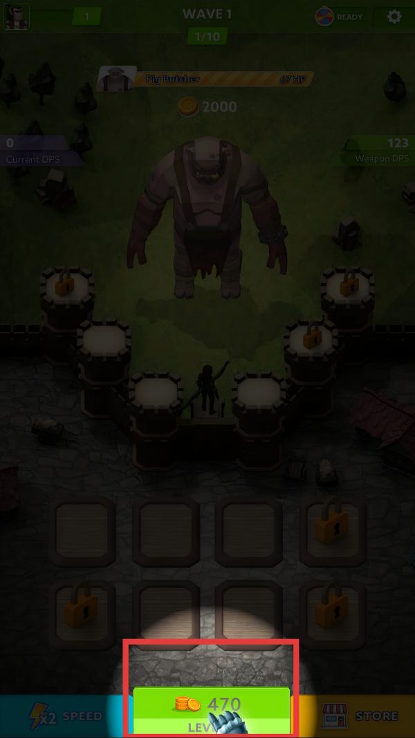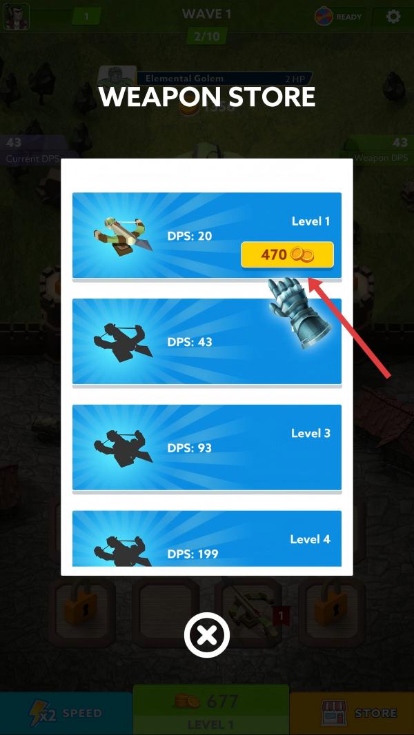 2、當看到屏幕下方顯示金幣可升級提示時,點擊進入WEAPON STORE武器商店界面,根據武器每秒傷害數值,花費金幣購買合適武器來提升輸出能力。