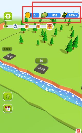 3、頂部區域,有金幣、綠鈔和類似能量的資源,是游戲內資源的持續產出速度,用于維持游戲內的建設和發展。