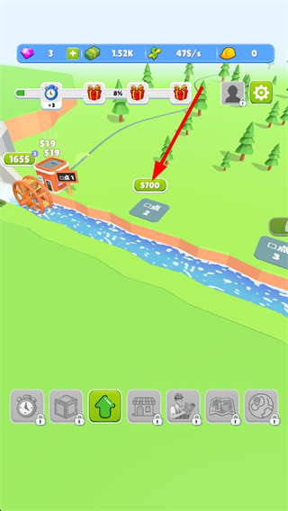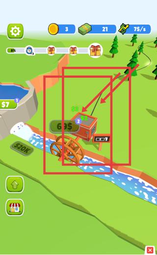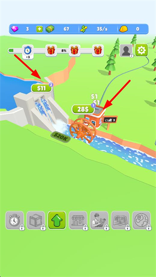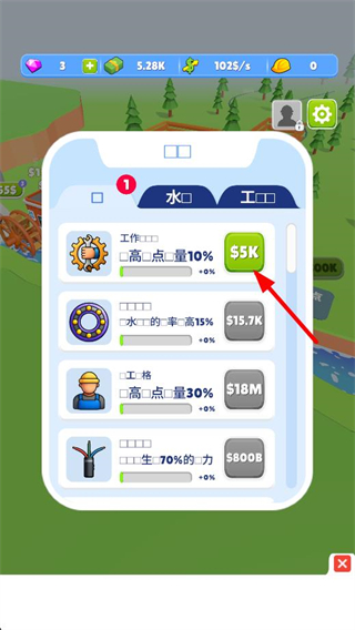 2、消耗收益解鎖水車等發電設備,連接水力資源,提升發電效率,增加每秒的收益速度。