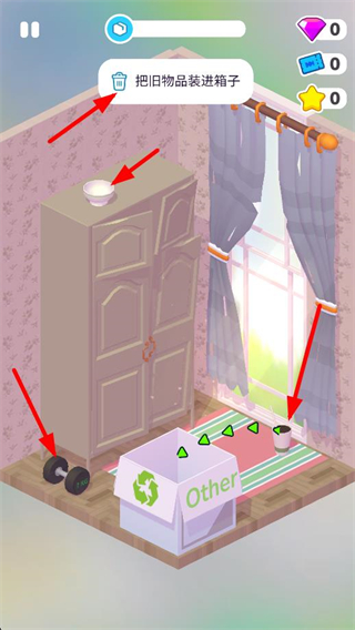 1、看到把舊物品裝進箱子的提示,找到房間里的舊物品,將它們依次放進對應的箱子里,完成舊物的收納整理。
