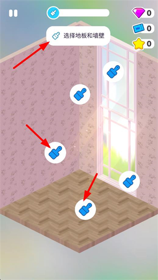 4、清潔完成后,看到選擇地板和墻壁的提示,點擊對應的裝飾按鈕,挑選喜歡的地板和墻壁樣式,進行房間的風格改造。
