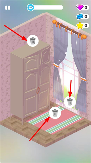 3、處理完箱子后,房間里會出現多個垃圾桶標識,對應不同的區域,按照提示清理這些區域,完成房間的初步清潔。