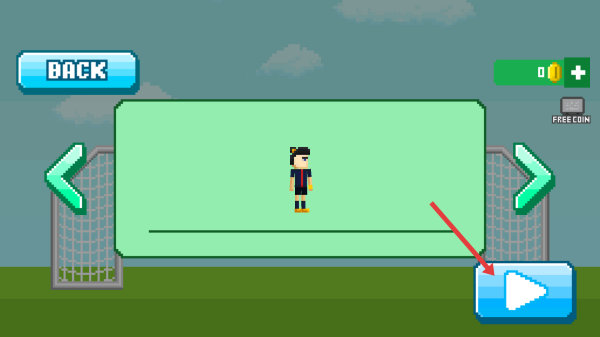 1、主界面點擊藍色播放鍵,選像素足球角色進入射門關卡,可先看FREECOIN領獎勵,熟悉BACK返回功能。