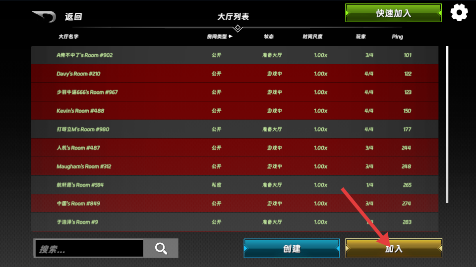 3、在大廳列表篩選合適房間,查看房間類型、狀態、玩家數等,選準備大廳且人數未滿的,點擊加入快速進入戰局,也可創建房間自定義規則,和好友或匹配玩家對戰。