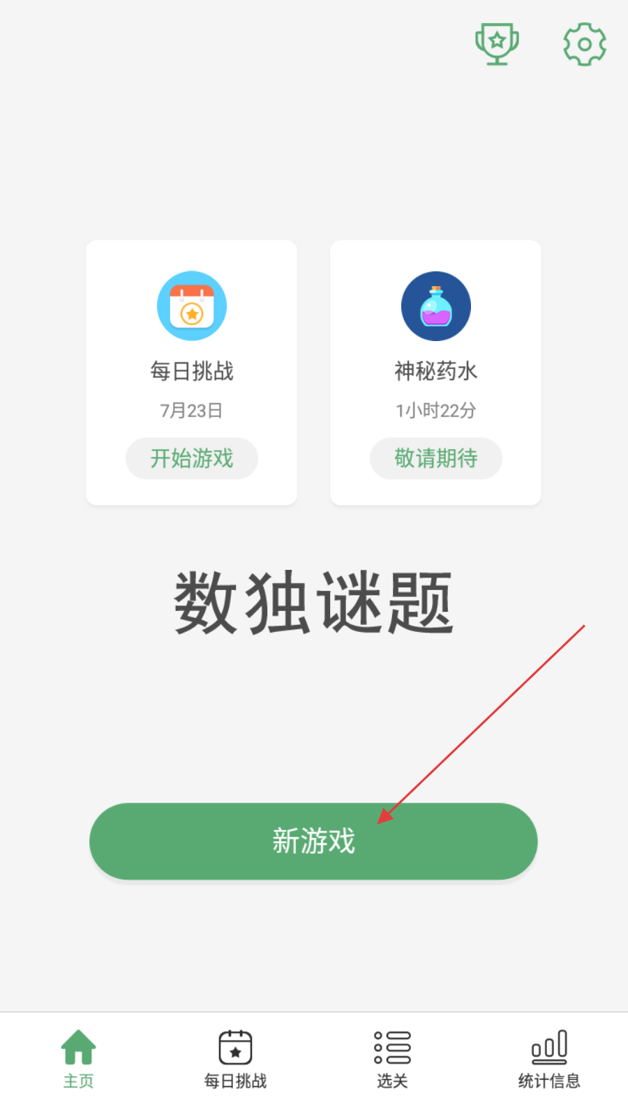 1、進入游戲后,點擊【新游戲】按鈕開始數獨游戲,也可選擇【每日挑戰】進行每日的數獨挑戰。