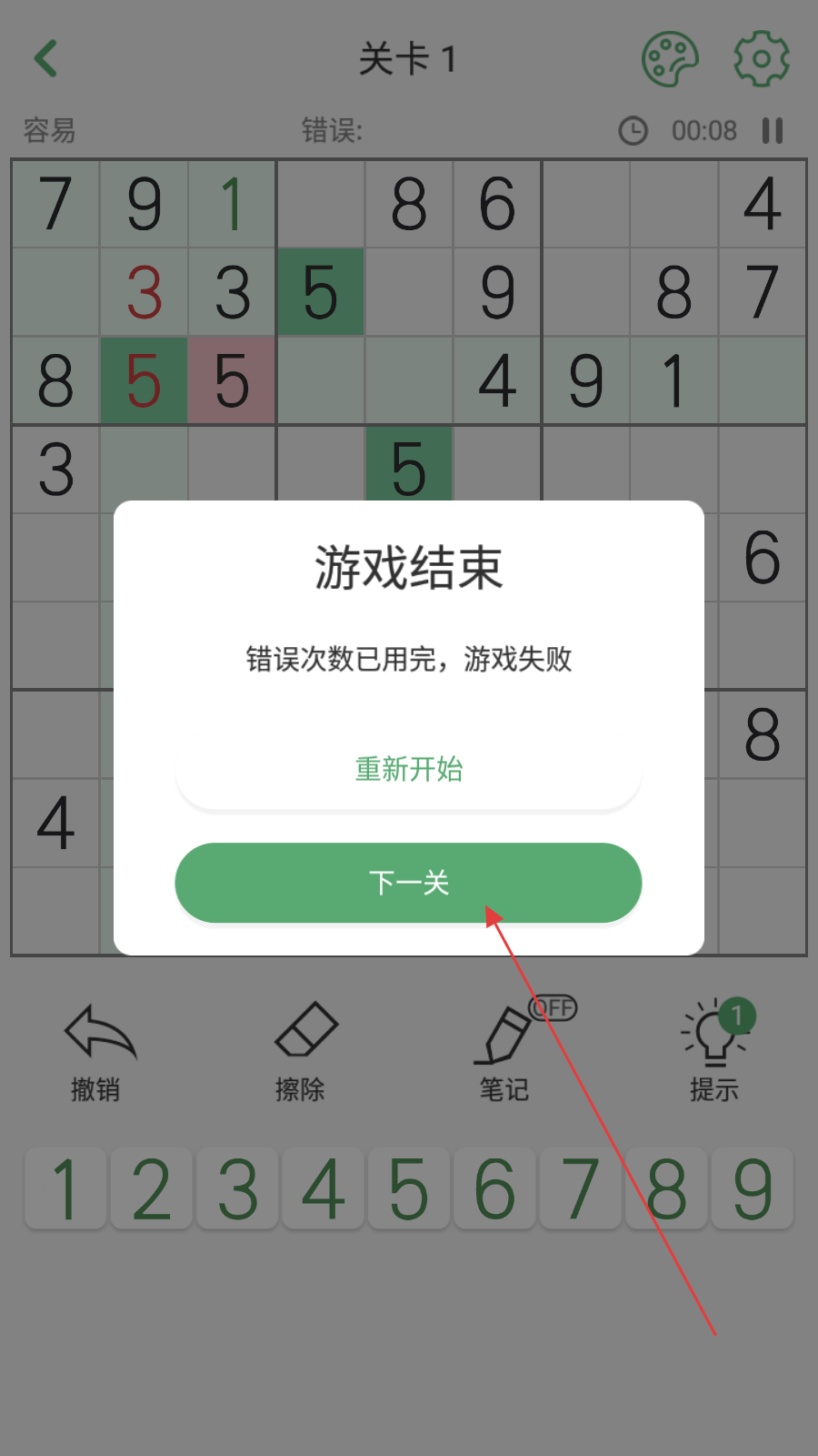 3、若錯誤次數用完,游戲會顯示【游戲結束】,此時可選擇【重新開始】重新挑戰當前關卡或下一關。