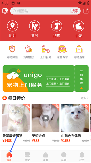 2、首頁,有寵物分類入口,涵蓋多類服務,設每日特價板塊展示商品,支持搜索與寵物上門服務體驗。