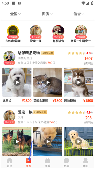 3、商家頁,展示認證商家及在售寵物,標注價格、商家評分與交易量,助力用戶選擇合規的寵物商家。