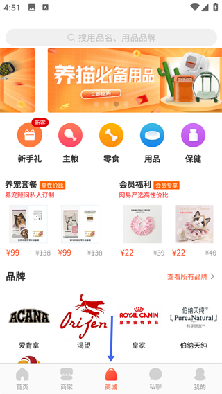 4、商城頁,分類呈現寵物用品,設養寵套餐與會員福利,展示知名品牌,滿足寵物生活物資的采購需求。