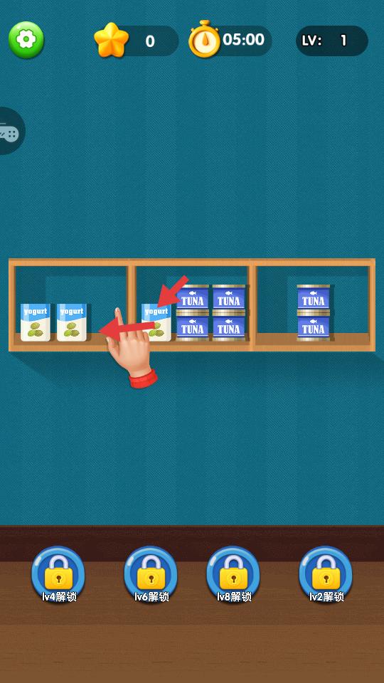 2、LV1關卡貨架分三格,需將中間格的酸奶罐拖至左側格,與同類型商品歸置,通過移動實現分類,每完成一組同類擺放,便向消除目標更近一步。