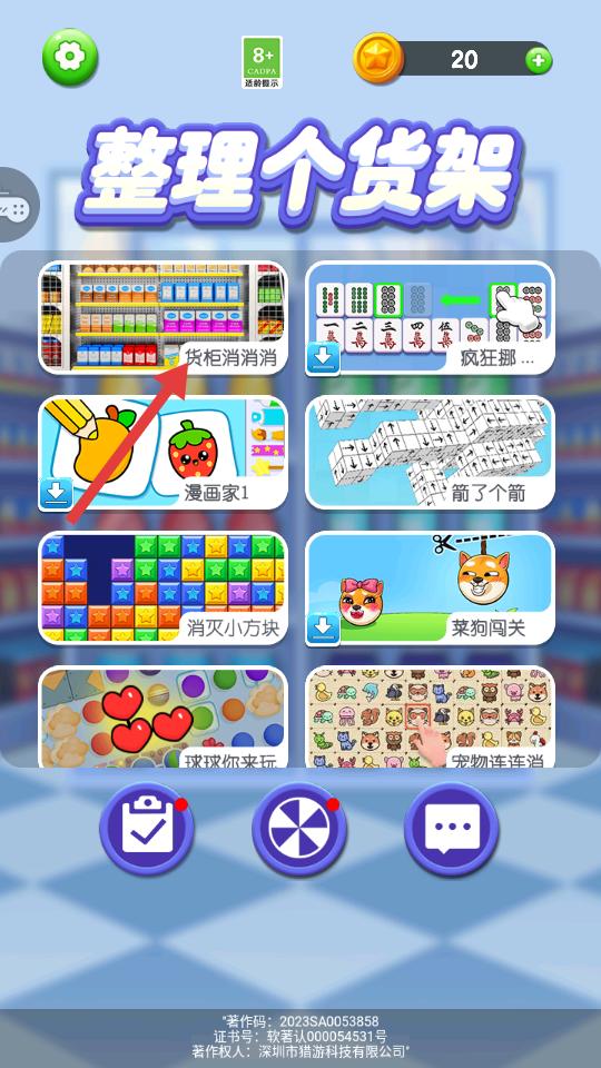 1、主界面羅列貨柜消消消、瘋狂挪等玩法模塊,點擊貨柜消消消圖標,即可進入整理關卡,在倒計時內按規則歸置物品,開啟貨架分類挑戰之旅。