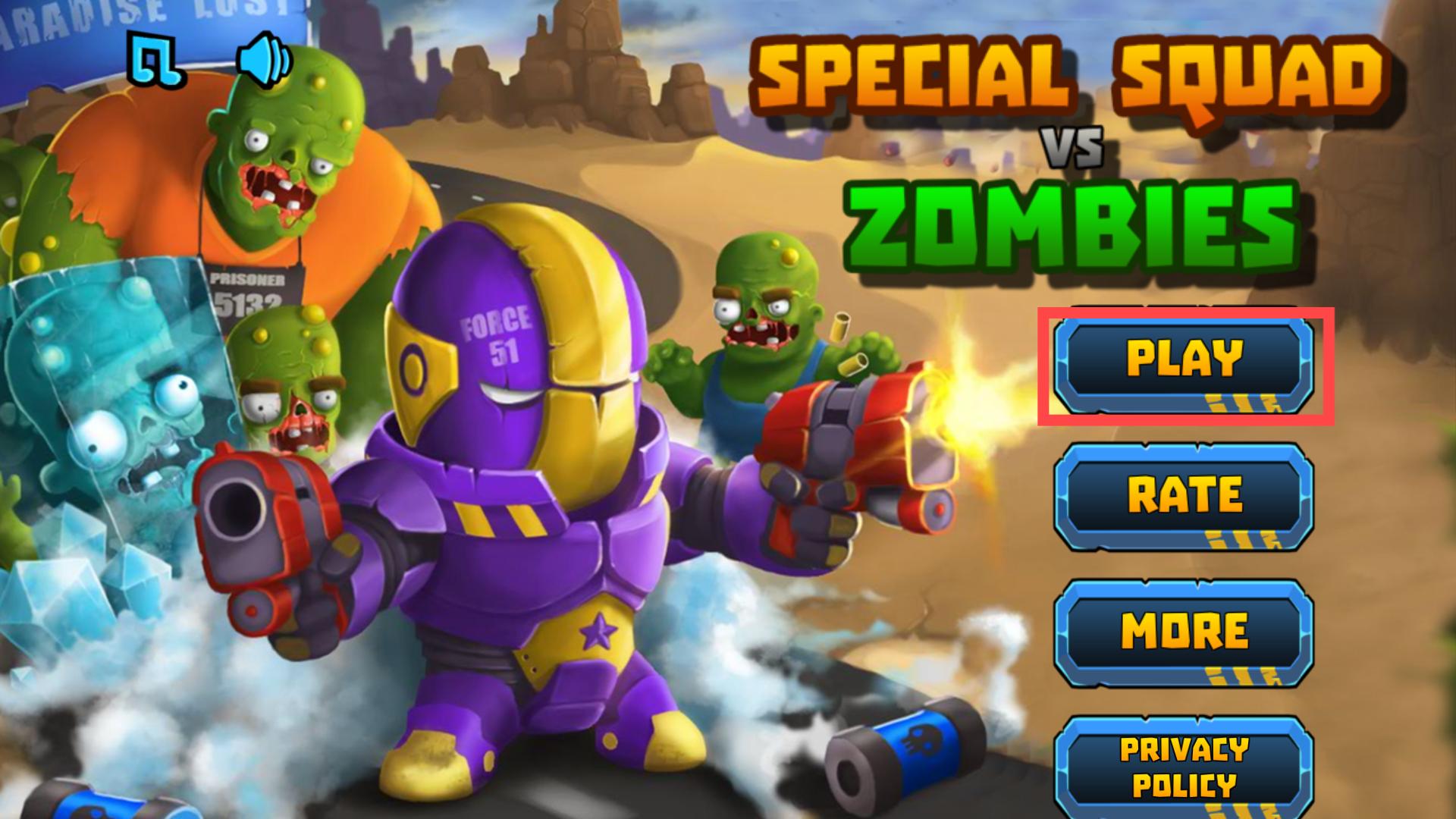 1、點擊PLAY按鈕進入游戲,操控紫色特戰隊員,在沙漠場景中對抗僵尸,開啟冒險戰斗。