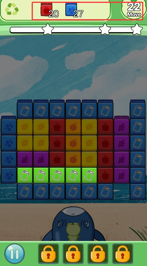 2、畫面上方會顯示這關要消哪些方塊,還有能走幾步,走一步少一步可得省著點用。