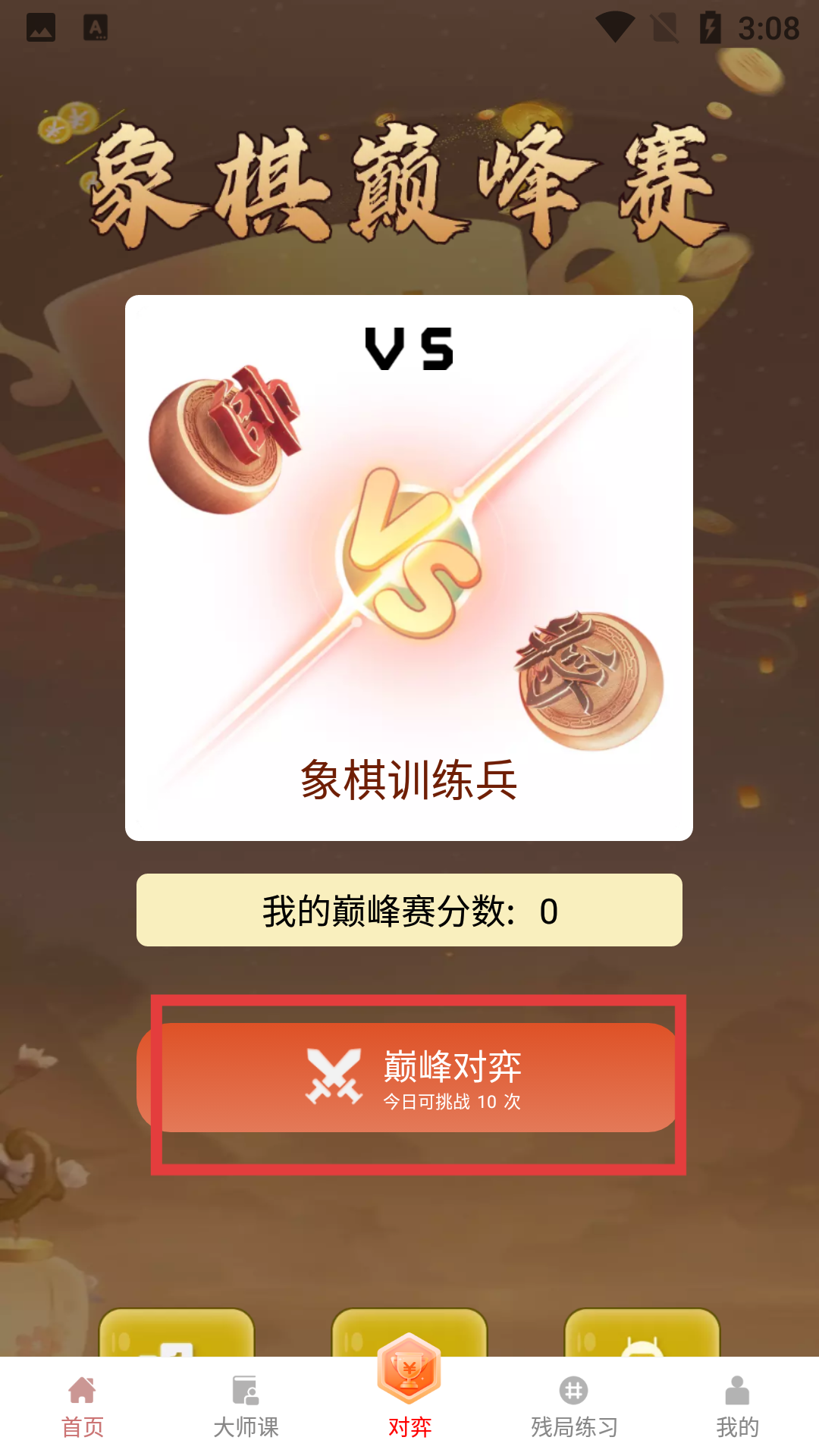 1、打開中國象棋大師進入首頁,在界面中找到趣味對弈、殘局練習等功能板塊,點擊對弈底部導航欄切換至對弈頁面,頁面展示象棋巔峰賽相關信息及巔峰對弈挑戰按鈕。