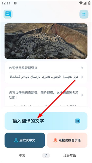 1、進入看到維漢翻譯官界面,設有輸入翻譯文字的框,還有點按說中文、點按說話按鈕,可切換語言進行文字翻譯。