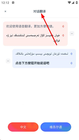 3、進入對話翻譯界面,界面提示可使用語音翻譯,底部有中文,點擊對應按鈕就能開啟語音翻譯操作。
