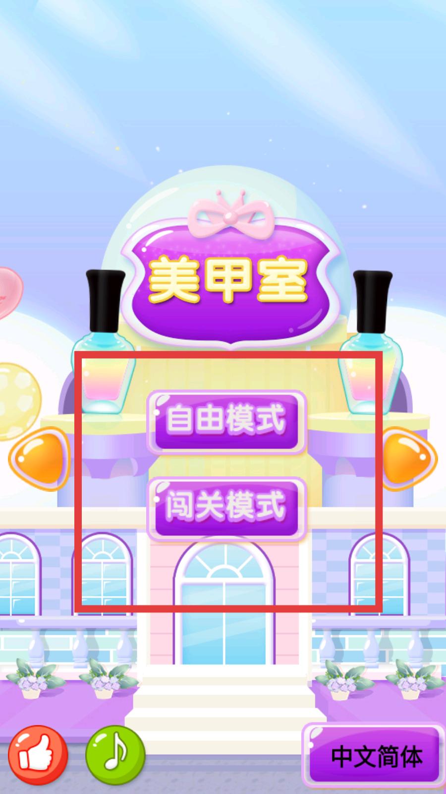 2、進入【美甲室】界面后,根據喜好選擇【自由模式】或【闖關模式】,點擊對應按鈕,進入美甲游戲環節。