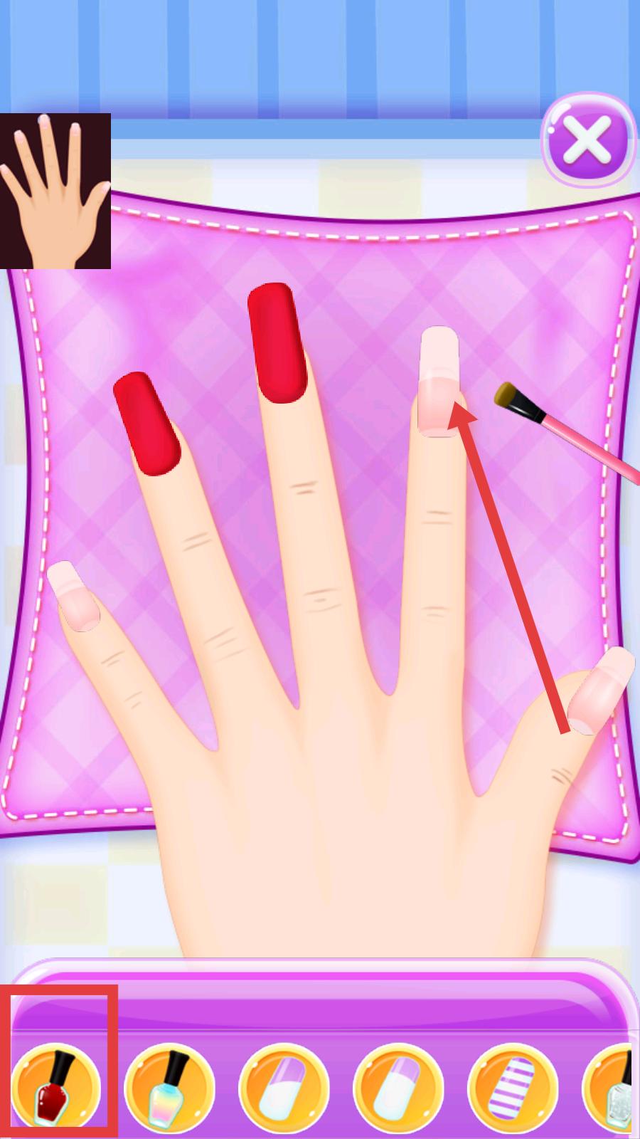 3、在美甲操作界面點擊底部如紅色指甲油等工具圖標,按照提示為手指涂抹指甲油,進行美甲裝扮操作。