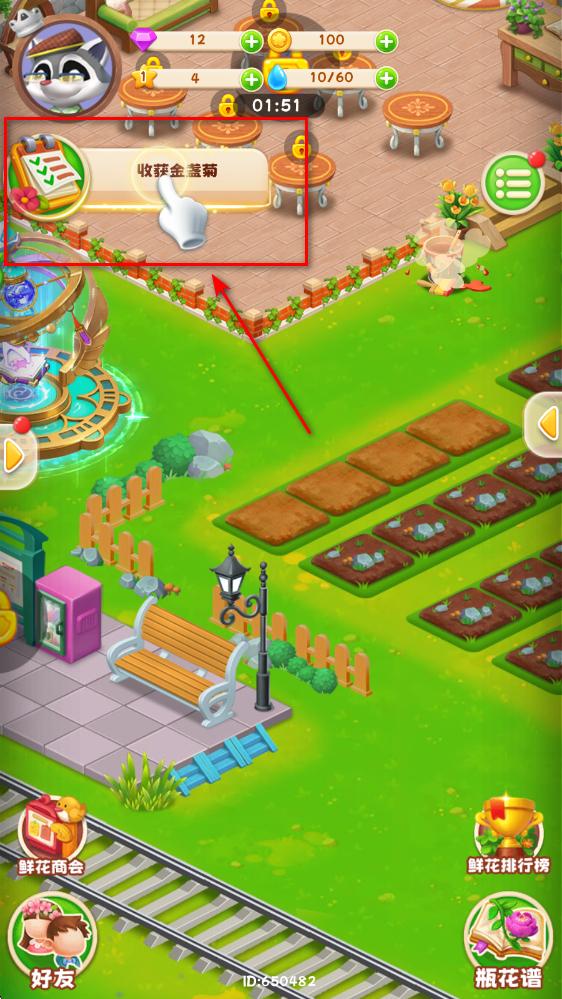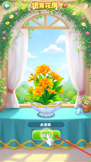 2、花卉成熟滿足收獲要求時,點擊界面收獲金盞菊任務提示,完成收獲,推進經營流程。