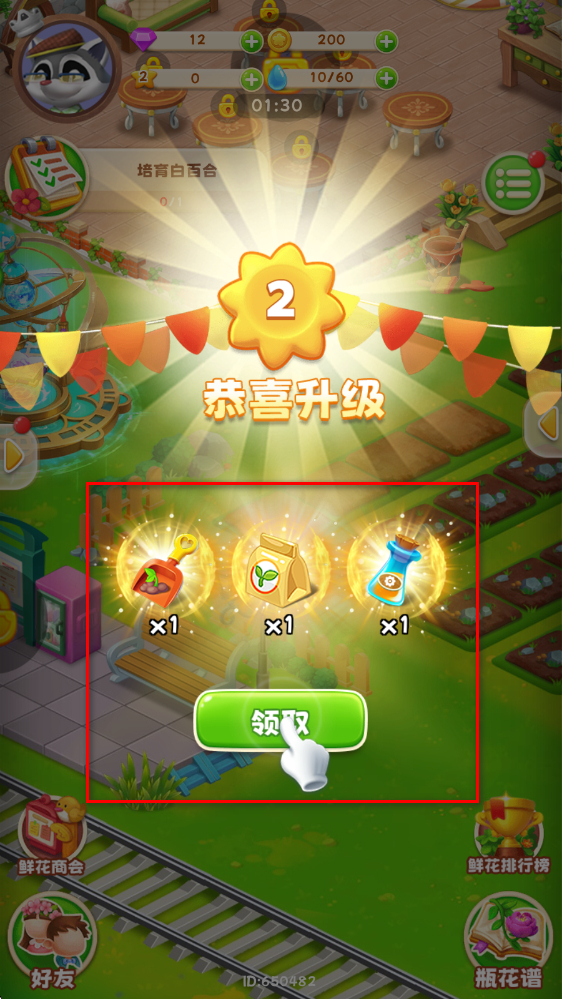 3、達成升級條件觸發升級彈窗,點擊領取鏟子、種子袋、藥劑等獎勵,用于花店經營。