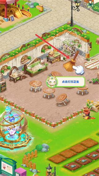 1、可點擊打掃衛生,清理場景里的蛛網等雜物,讓花園環境變得整潔,為后續經營做準備。