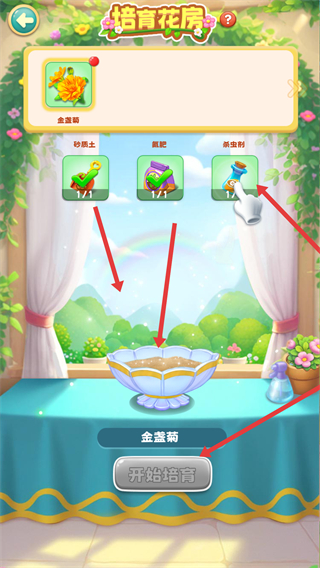 2、在培育花房,可準備妙黑土、氮肥、殺蟲劑等材料,點擊開始培育種植金盞菊等花卉。