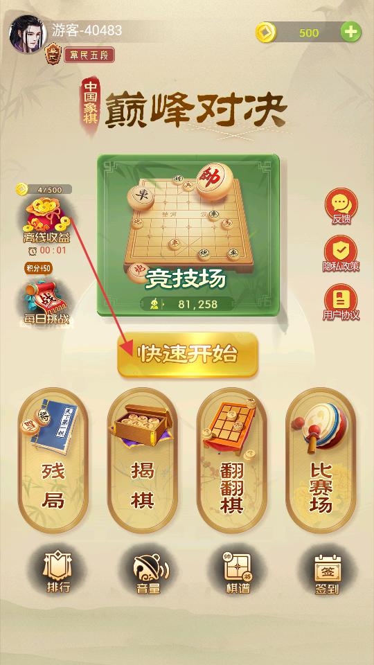 2、完成簽到后,回到主界面,看到巔峰對決及快速開始按鈕,沿紅色箭頭點擊快速開始,進入競技場匹配對手,準備開啟象棋對戰。