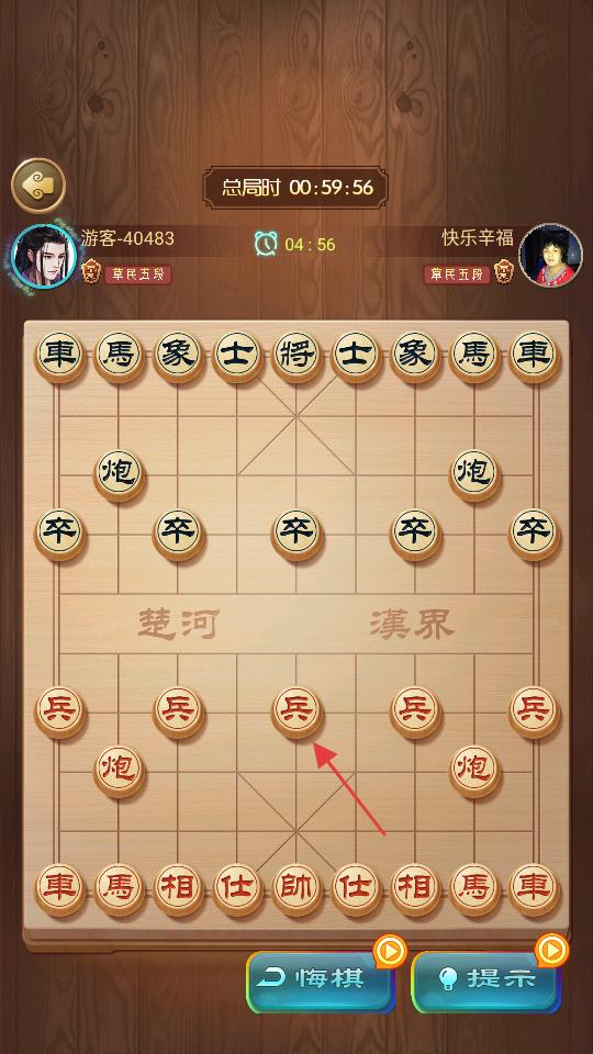 3、進入對戰界面,看到象棋棋盤及雙方棋子,根據紅色箭頭指向,移動己方兵棋子,按照象棋規則落子,與對手進行策略博弈,爭取贏得對局。