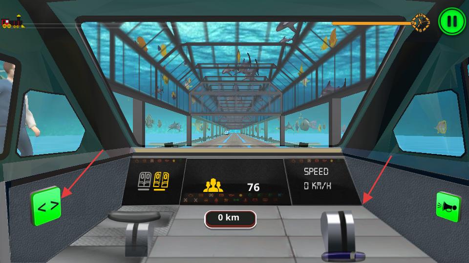 2、進入駕駛艙,先按左側綠色按鈕啟動系統,再操作右側操控桿調節速度,留意速度表與乘客數,平穩行駛。