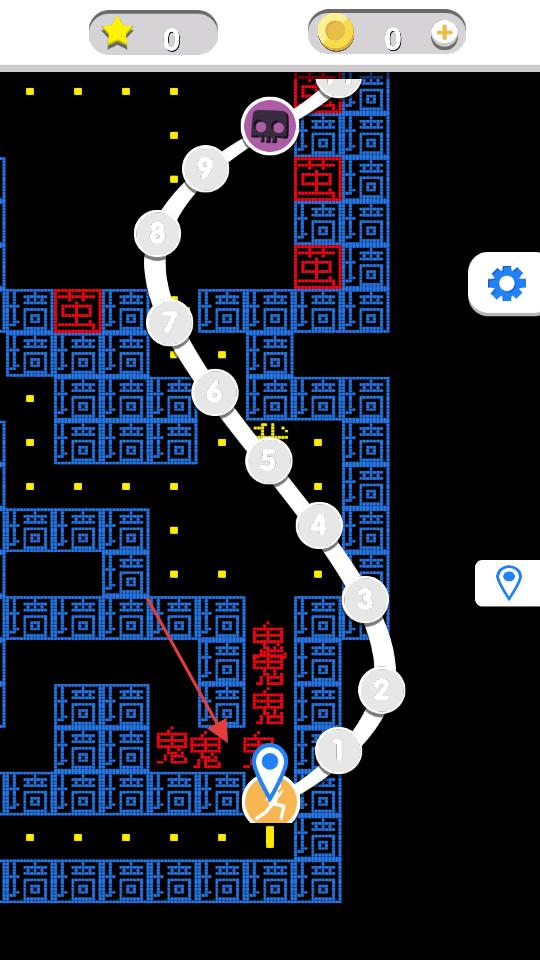 2、在關卡選擇界面,看到帶有數字標識的路線及藍色地圖,依據紅色箭頭指引,點擊對應關卡位置,確定挑戰關卡,進入迷宮場景。