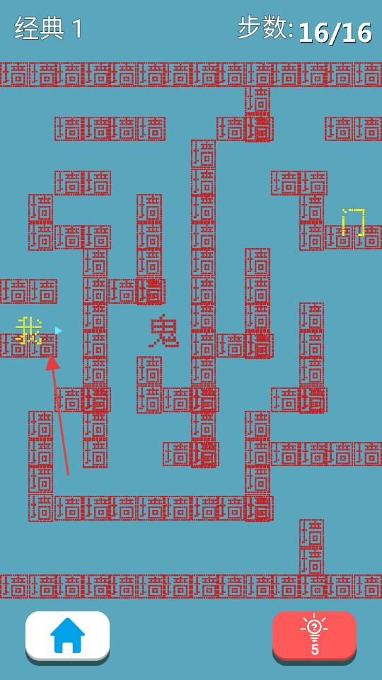 3、進入迷宮關卡,看到紅色墻壁構成的迷宮布局以及我的位置標識,按照紅色箭頭指向,移動角色,沿路徑探索,嘗試走出迷宮,完成挑戰。