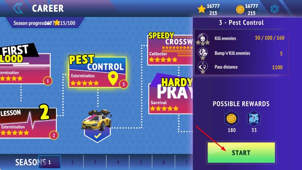 2、在生涯模式界面,選擇如PEST CONTROL任務,點擊START按鈕,開始該任務的賽車戰斗。
