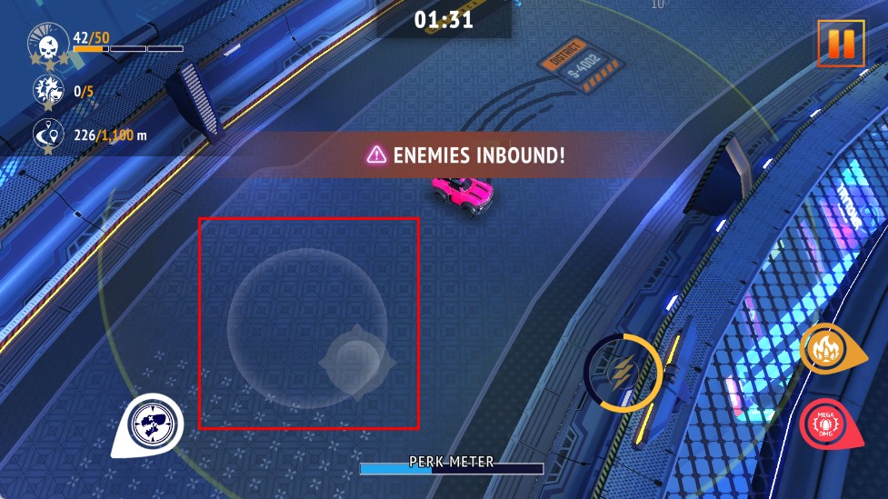 3、進入戰斗場景后,操控虛擬搖桿,控制賽車在場景移動,調整位置,應對即將到來的敵人。