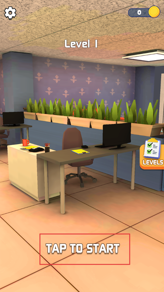 1、關卡1準備界面,點擊開始游戲,進入辦公室場景,開始關卡一玩法,完成關卡任務。