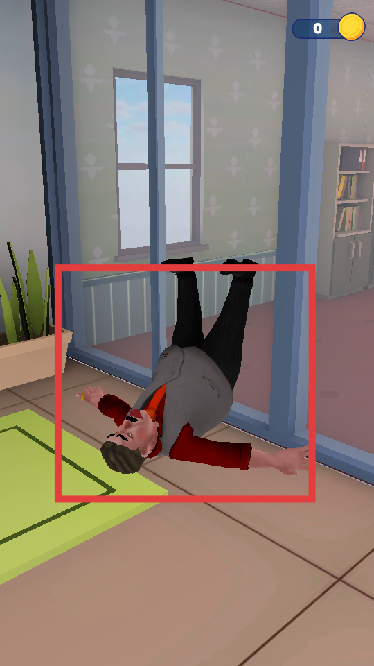 3、游戲場景中,老板因油壺導致腳滑,人物呈現倒地狀態,操控角色探索房間,觸發或解決導致倒地的事件,推進劇情。