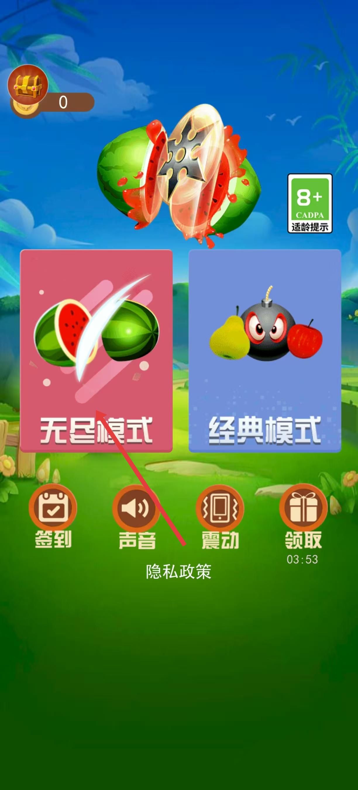 1、進入佳作初始界面,看到無盡模式與經典模式選項,沿紅色箭頭點擊無盡模式,開啟無限制切水果挑戰。