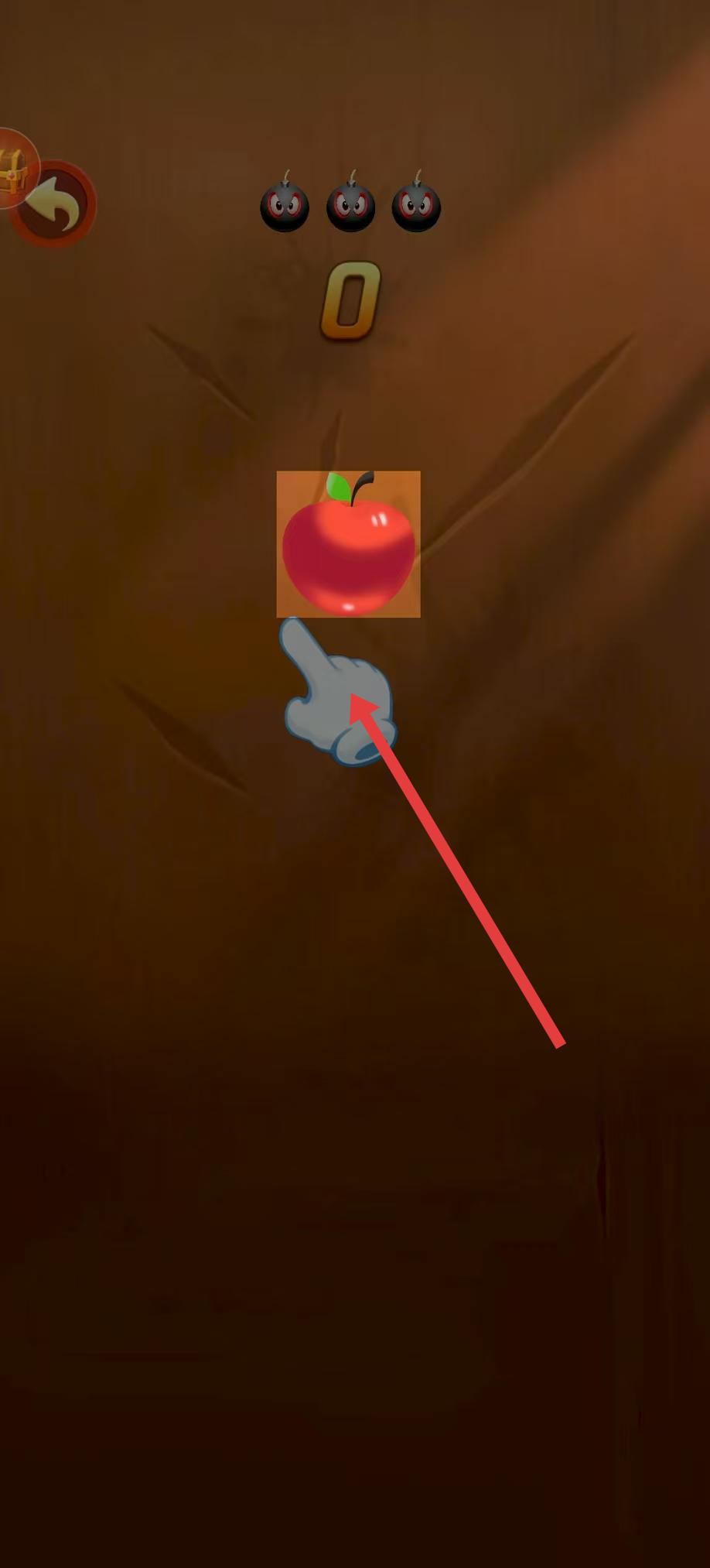 2、進入無盡模式后,看到屏幕中出現的蘋果,依據紅色箭頭指引,快速滑動屏幕切割蘋果,避免碰到炸彈。