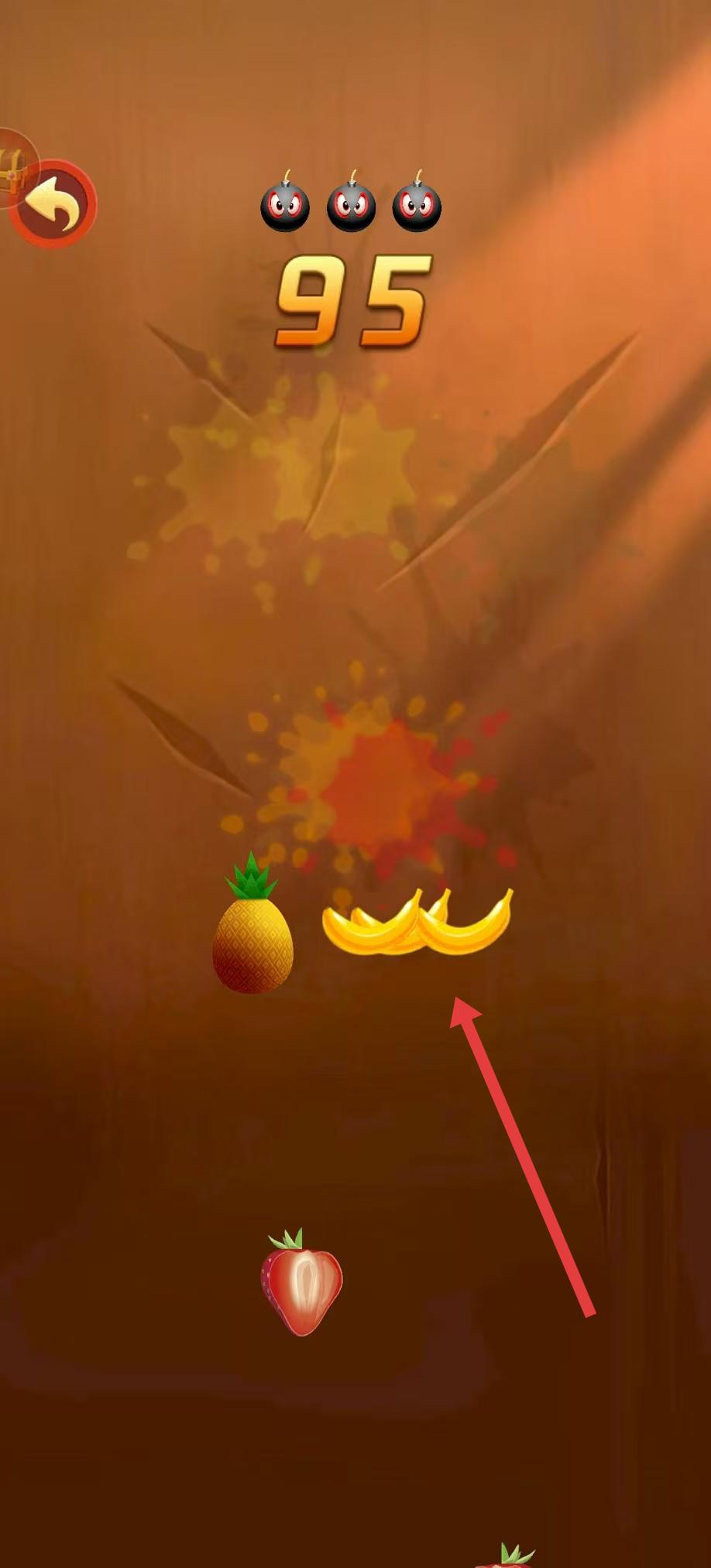 3、持續切割水果過程中,看到新出現的香蕉等,按照紅色箭頭指向,精準滑動切割,積累分數,推進游戲進程。