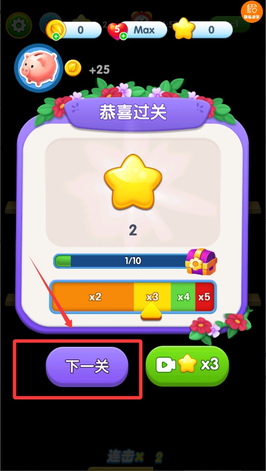 3、成功消除所有目標花朵后,畫面會彈出"通關"的金色彈窗,點擊左側的"下一關"按鈕即可進入更復雜的關卡。