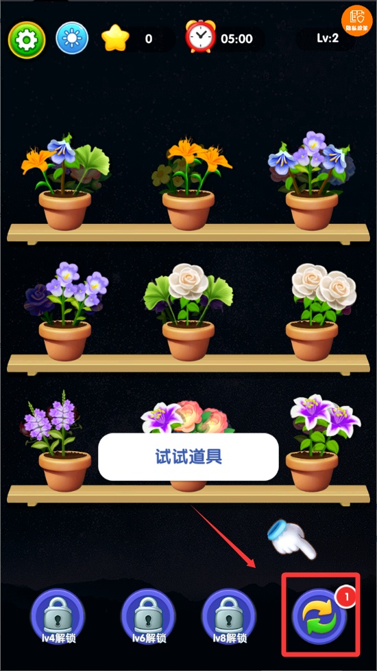 4、遇到卡關時可以使用右下角帶箭頭標志的旋轉道具,點擊后會隨機重置場上所有花朵的顏色排列。