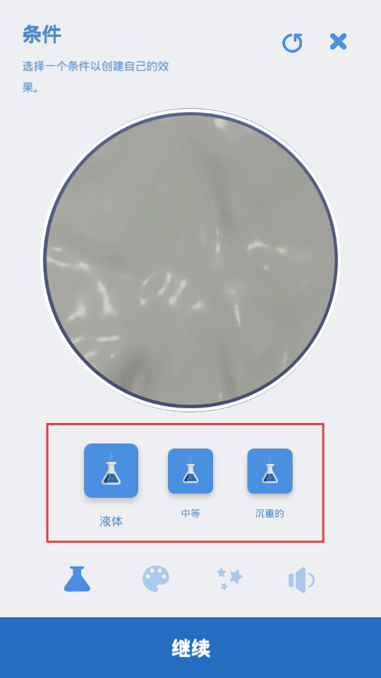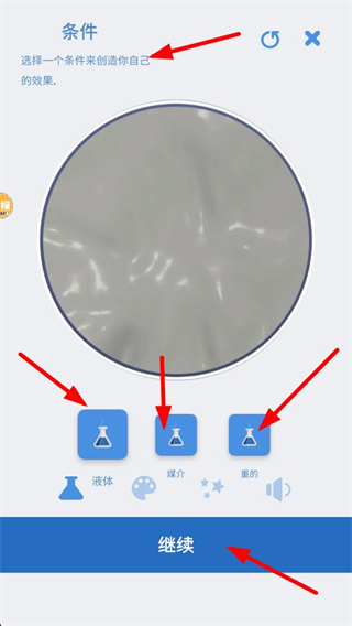 3、之后進入條件選擇界面,挑選液體媒介等條件選項,選定后點擊繼續,為流體效果添加對應的屬性設定。