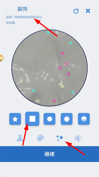 4、進入裝飾界面,選擇喜歡的裝飾樣式,應用到流體畫面里,完成后點擊繼續,呈現完整的流體藝術作品。