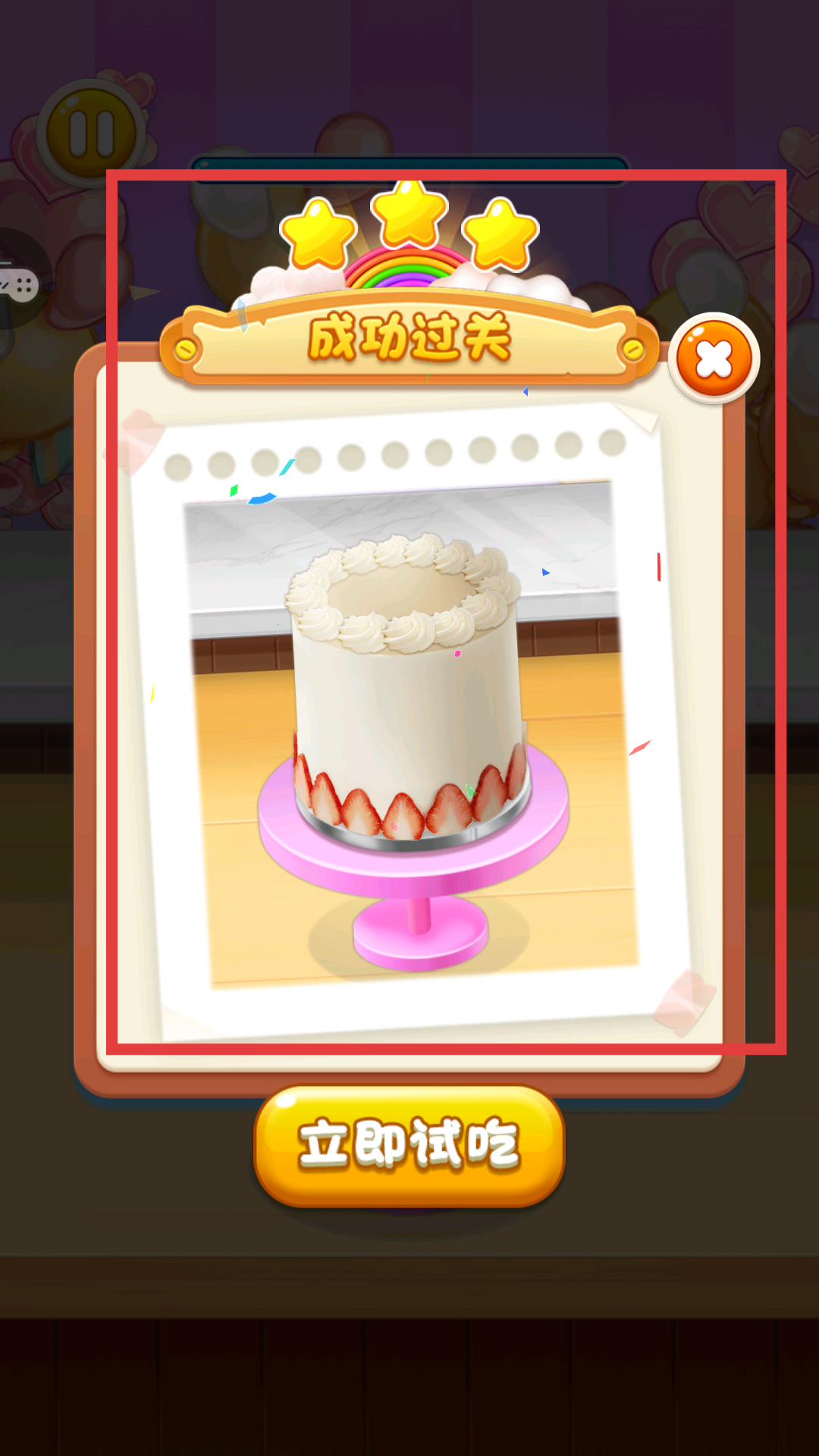 3、拍攝完成后觸發成功過關彈窗,彈窗展示蛋糕成品圖片、三星評價及立即試吃按鈕,可點擊該按鈕體驗試吃流程,或關閉彈窗進入下一關。