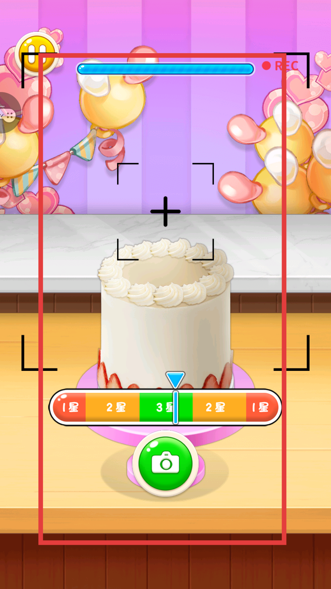 2、材料準備完畢后,跳轉至蛋糕裝飾及拍照環節,界面展示裝飾好的蛋糕、拍照取景框及星級評分條,調整評分條指針至合適星級,點擊拍照按鈕完成蛋糕成品拍攝記錄。