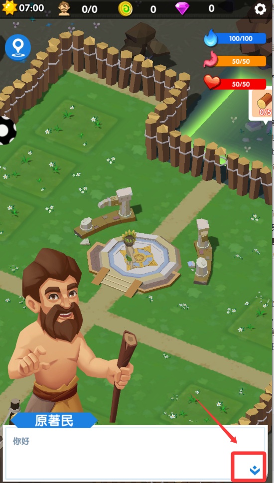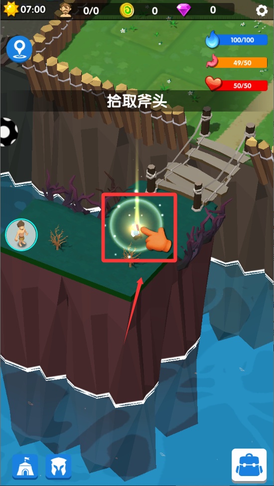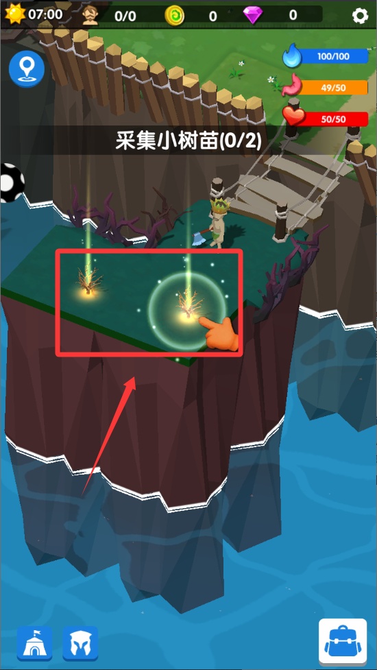 3、在場景中央位置有一株發光的幼苗,使用工具欄中的斧頭圖標對準它。連續點擊三次就能完成砍伐,同時獲得木材資源。